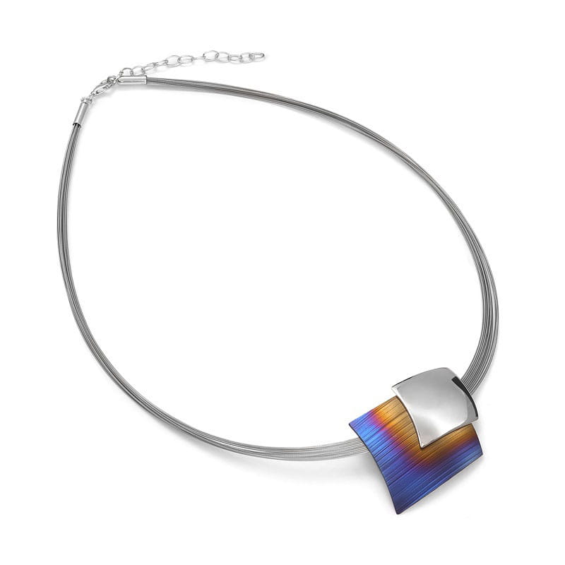 Niezwykle oryginalny, gustowny naszyjnik wykonany z najwyższej jakości stalowych linek z dwoma geometrycznymi dodatkami – gładkim, wykonanym z rodowanego srebra oraz tytanowym w kolorach tęczy.