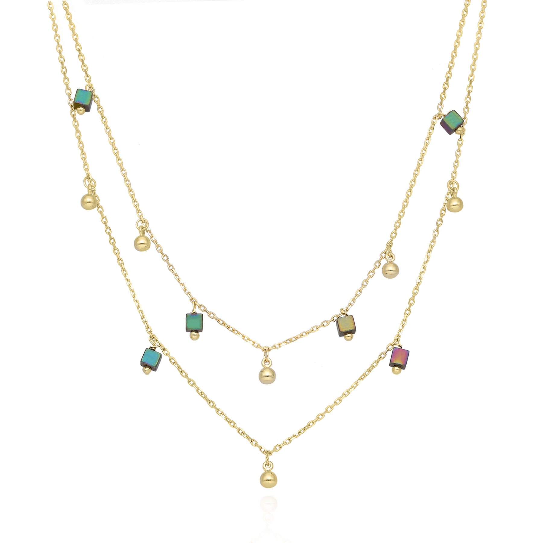 Niezwykle efektowny srebrny naszyjnik pokryty 24-karatowym złotem wraz z gustownymi kuleczkami i kolorowymi Hematytami na podwójnym łańcuszku to wyjątkowa propozycja dla wyjątkowych kobiet.